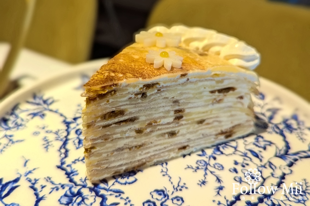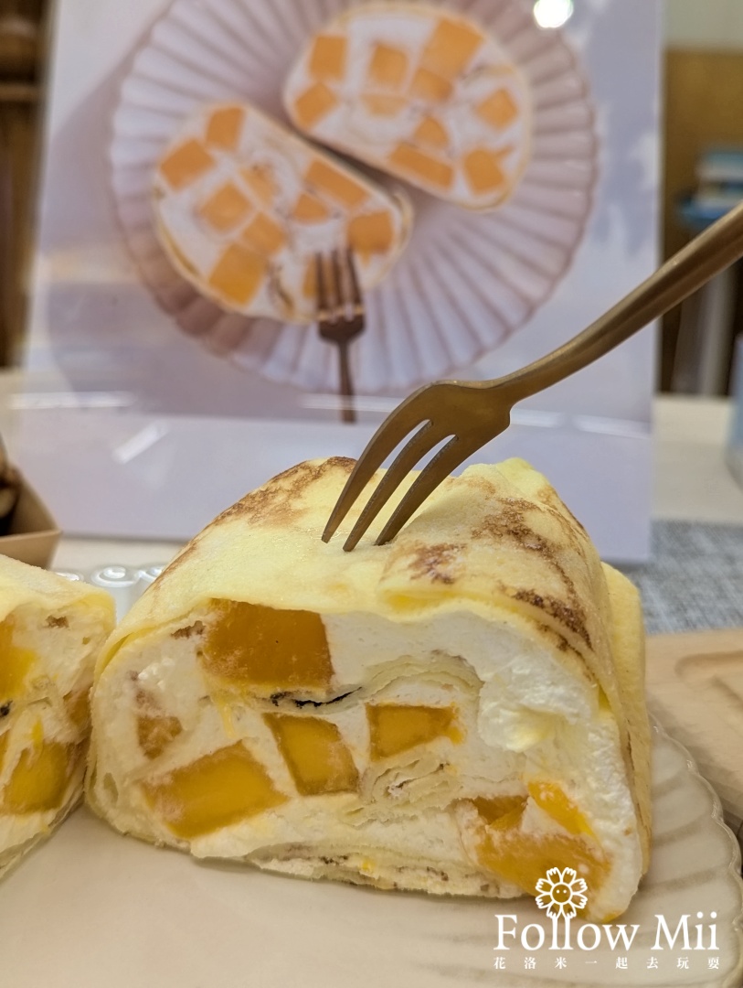 這造型可愛的是芒果千層毛巾捲,連名字都很可愛啊!這可是夏季限定的商品,用了五片的千層餅皮,再加上至少半顆的新鮮芒果和滿滿的卡士達內餡。