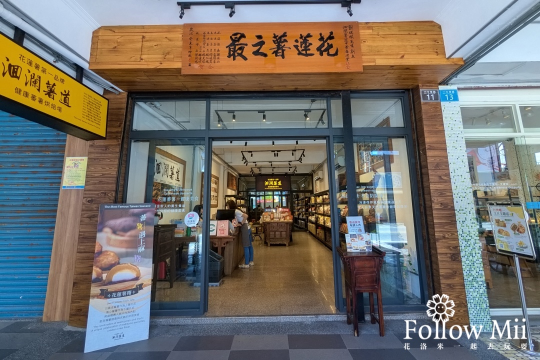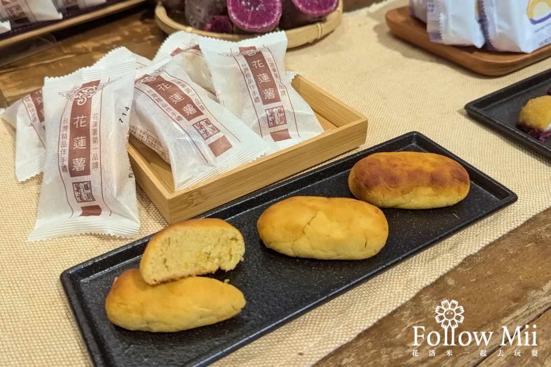 洄瀾薯道最有名的就是花蓮薯了,老師父遵循老一輩所留下的手工技藝,以花蓮在地蕃薯所精製,做法是先將蕃薯去皮、蒸熟、搗泥、炒餡、冷卻、手握成型、烘焙而成。為了降低甜度採用日本進口比砂糖貴了七倍以上的天然海藻糖,算是台灣最健康養生的美食名產。