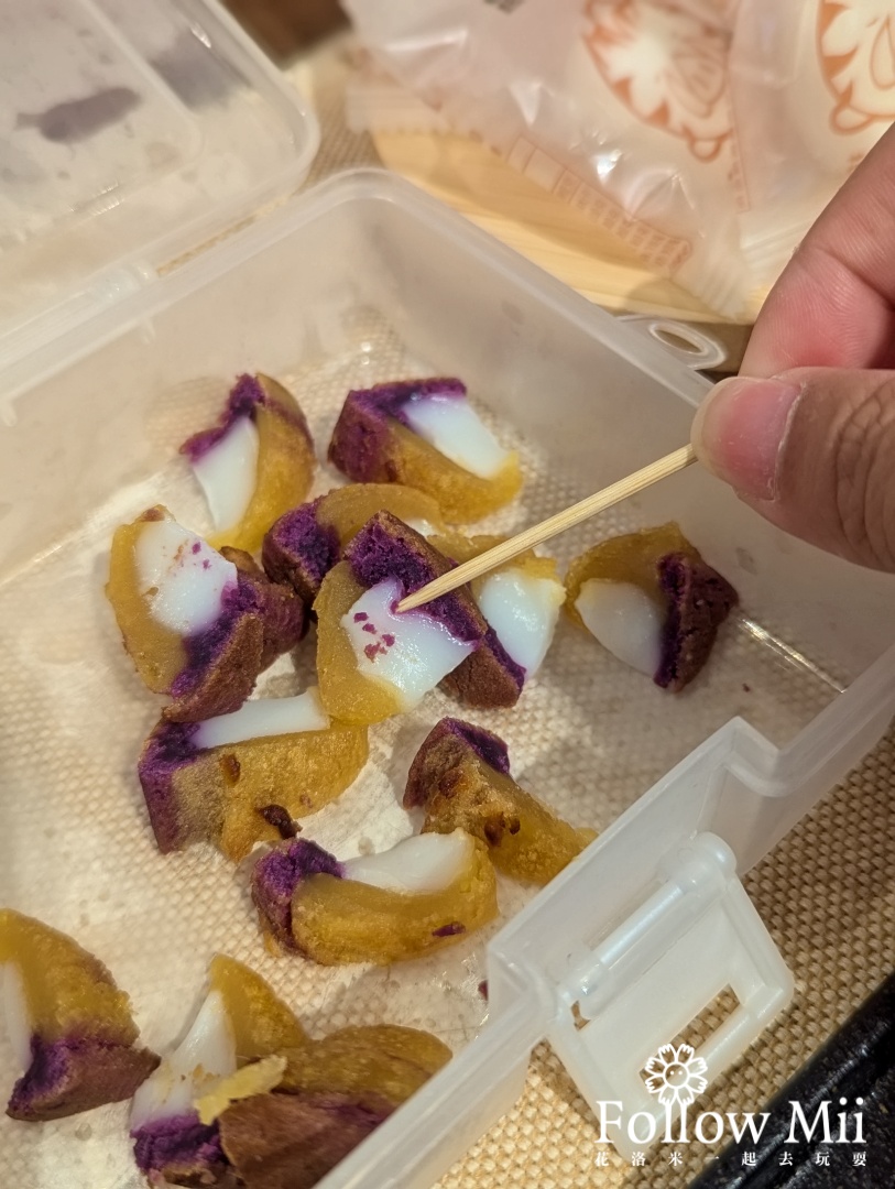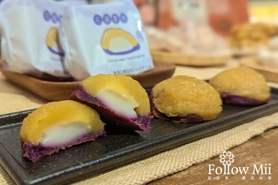 這個顏色層次分明,又是金黃又是紫色的是甚麼啊?這就是它們另一個招牌品項,花蓮薯糬。師傅將黃金蕃薯作為上層外皮、紫心蕃薯作為下層外皮,將麻糬裹入其中作為內餡,巧妙的將花蓮薯結合麻糬創造了全新的花蓮名產〝花蓮薯糬〞。