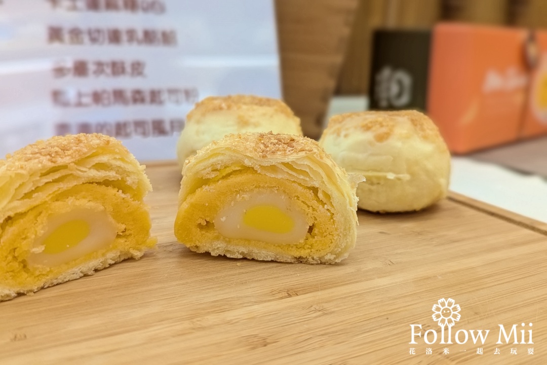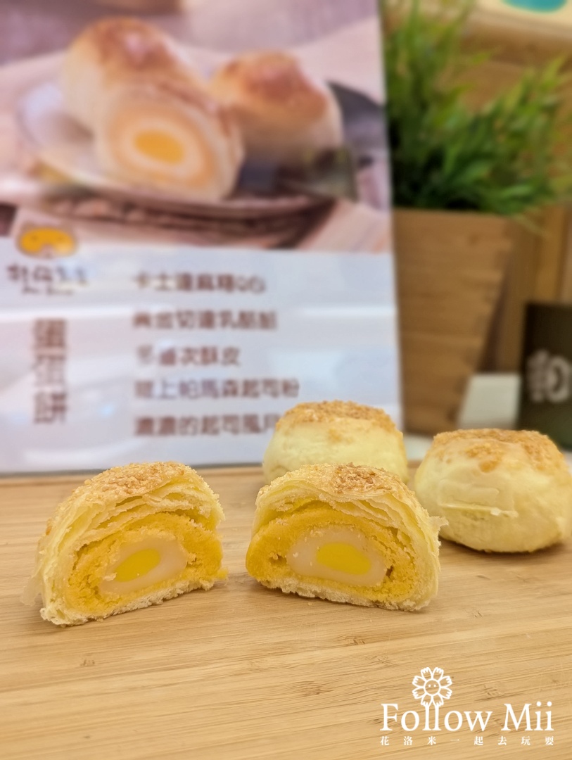但這蛋蛋餅真的不是蛋黃酥啦!內餡有黃金切達乳酪,然後加上卡士達麻糬Q心,接著外裹上多層次的酥皮。最後,在撒上帕馬森起司粉,是不是最後猛一看很像蛋黃酥啊!