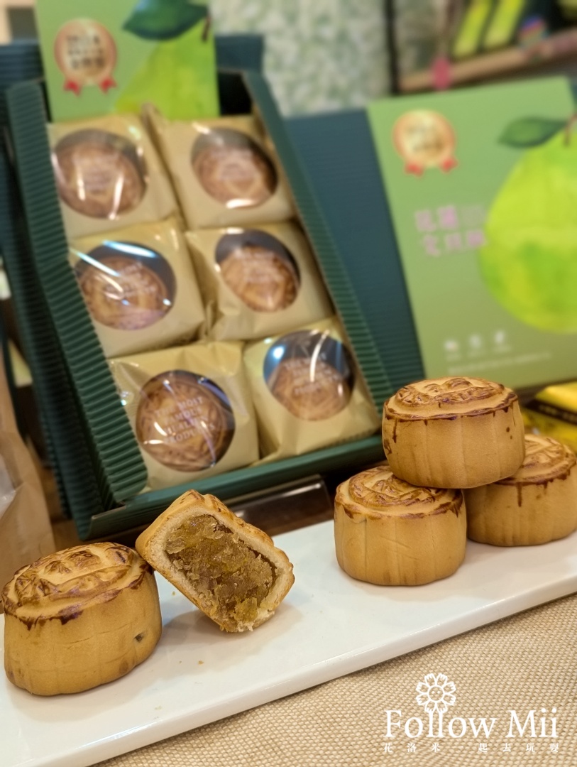 青柚燒,咬開餅皮會發現柚皮和柚果肉熬煮後的晶瑩清亮,特別是柚果肉口感綿密,柚皮的甘、Q、口感十足,果肉與柚皮在嘴裡交融,呈現柚子最天然細緻的酸香甘甜。
