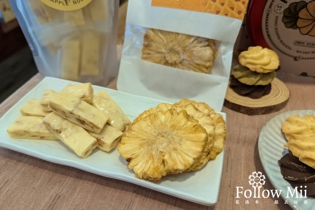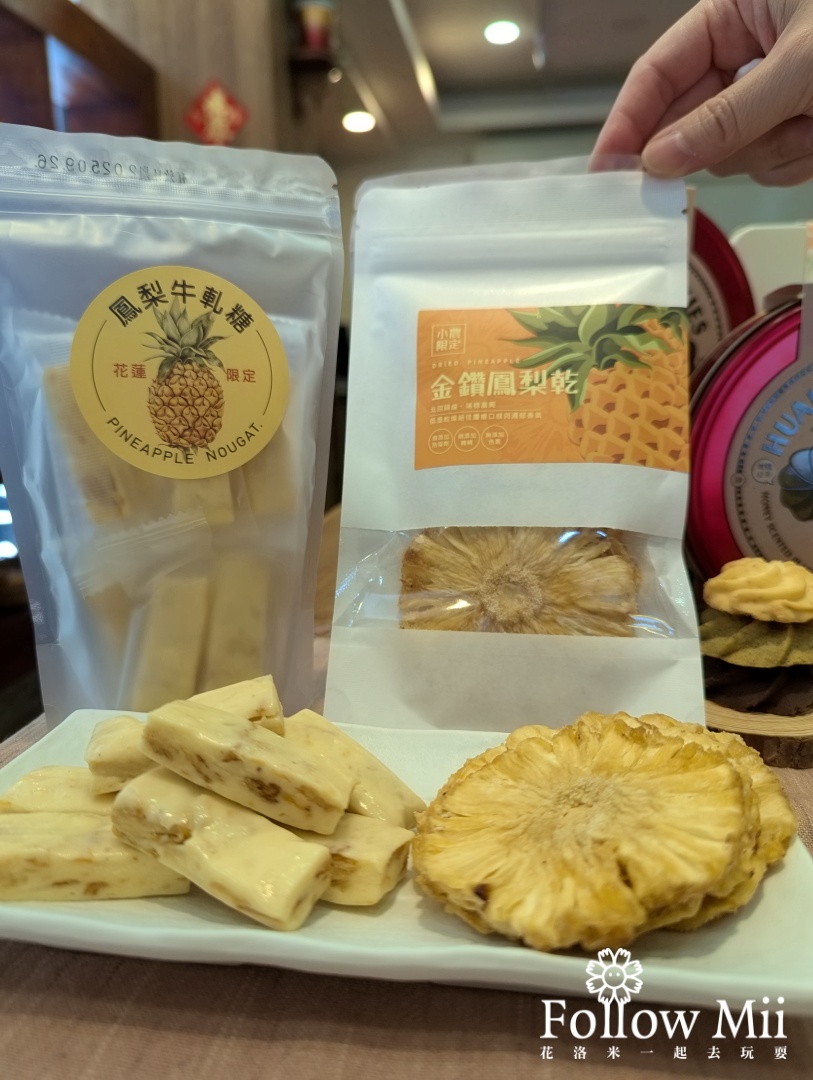 你以為這樣就沒有了嗎?它們還有鳳梨牛軋糖和金鑽鳳梨乾。不黏牙也不會過甜的鳳梨牛軋糖小孩很喜歡,酸酸甜甜的很好吃。而用花蓮瑞穗鳳梨切片後低溫製成的鳳梨乾,花洛米和老公超喜歡,追個劇就吃完一包了。