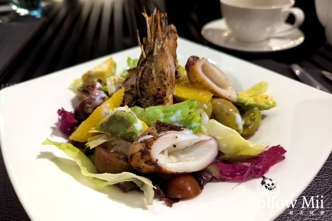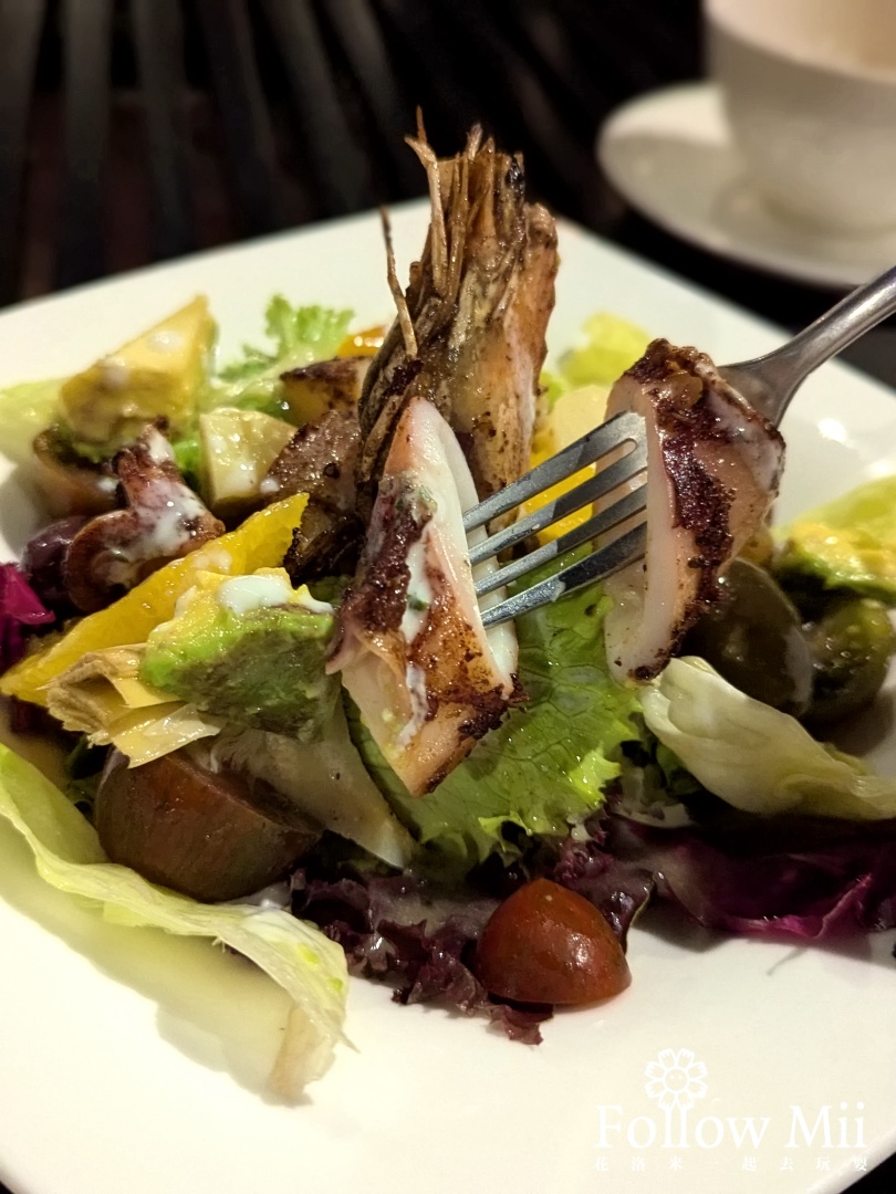沒想到選對了,這沙拉裡面的蝦子和花枝都是剛烤好的,熱呼呼的又很新鮮,超好吃的啊!