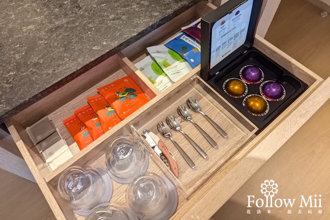 底下抽屜拉開,茶包、膠囊還有杯子都在這了。