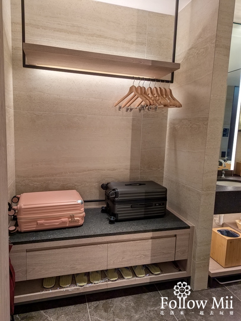 一進門旁邊是衣櫃,開放式的設計,空間更顯通透。重點是,行李箱放這裡好方便啊!