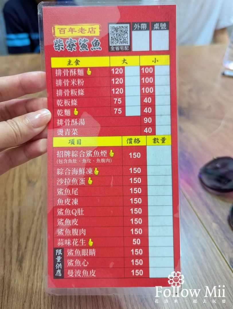 以下這張就是柴寮鯊魚的菜單,餐點品項算是單純,就是主食加上小菜。