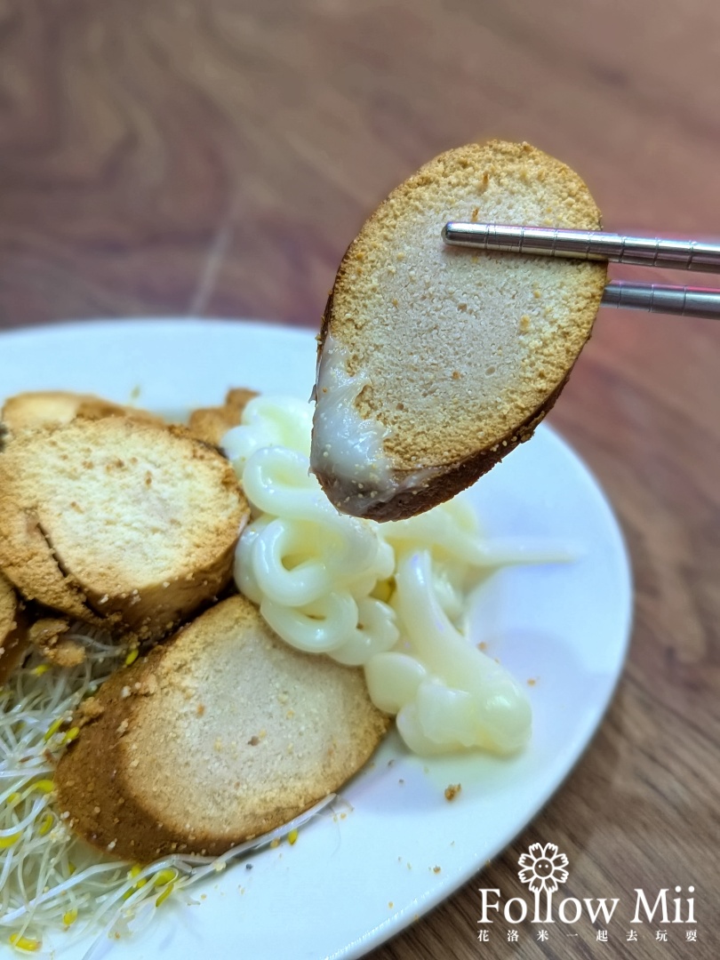 這裡的魚蛋是煙燻的,顏色相比之下稍微深一點。本身就有煙燻的香氣,如果單吃其實也挺好吃的。但是加了一點沙拉醬後,多了滑順的口感更為誘人。