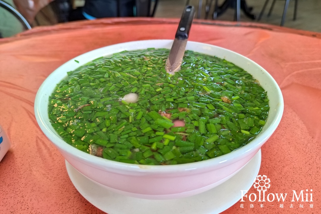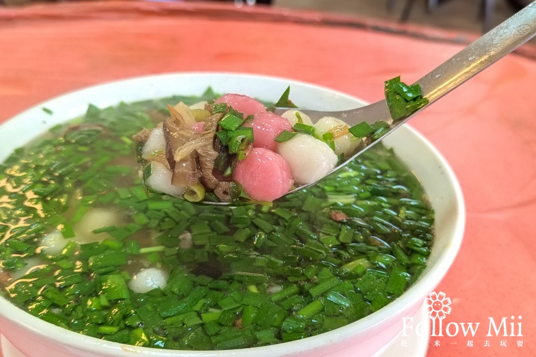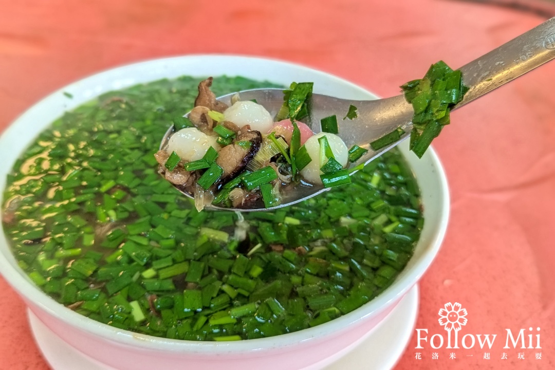 一大碗的客家湯圓,用香菇和蝦米爆香的湯頭,加上大量的韭菜,讓每一口喝起來都是層次豐富。