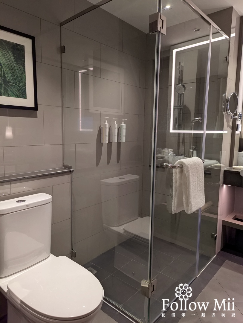 浴室滿大的,左邊是乾濕分離的淋浴間和馬桶。