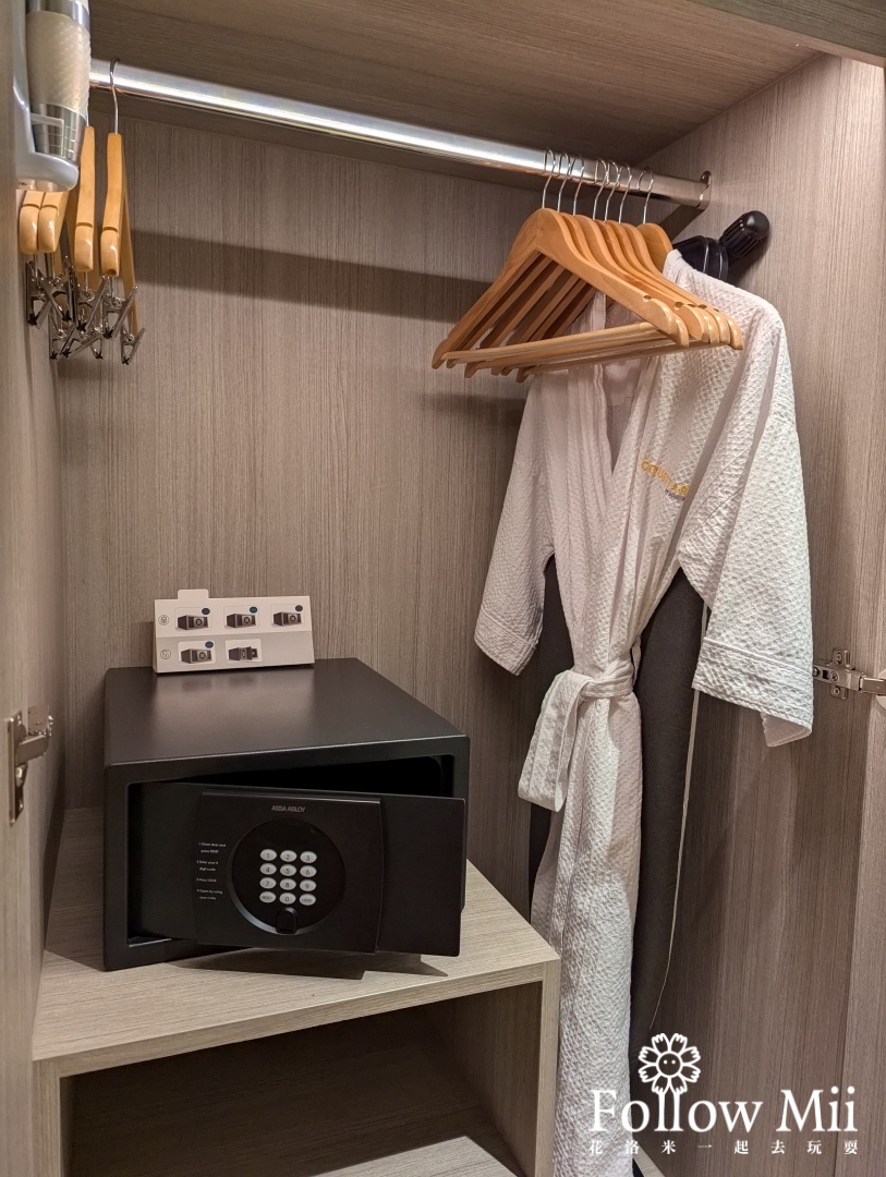 門口進來右手邊是衣櫥,有浴袍可供使用。保險箱也在這裡喔!