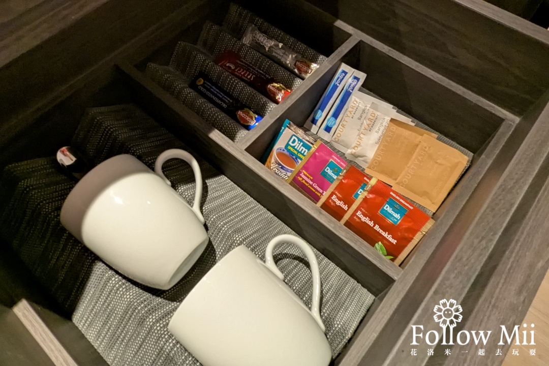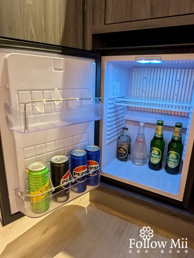 吧台區,給水很大方,直接給了四罐,加分。底下有杯子和茶包。另外,點心和冰箱的飲料都是要收費的喔!