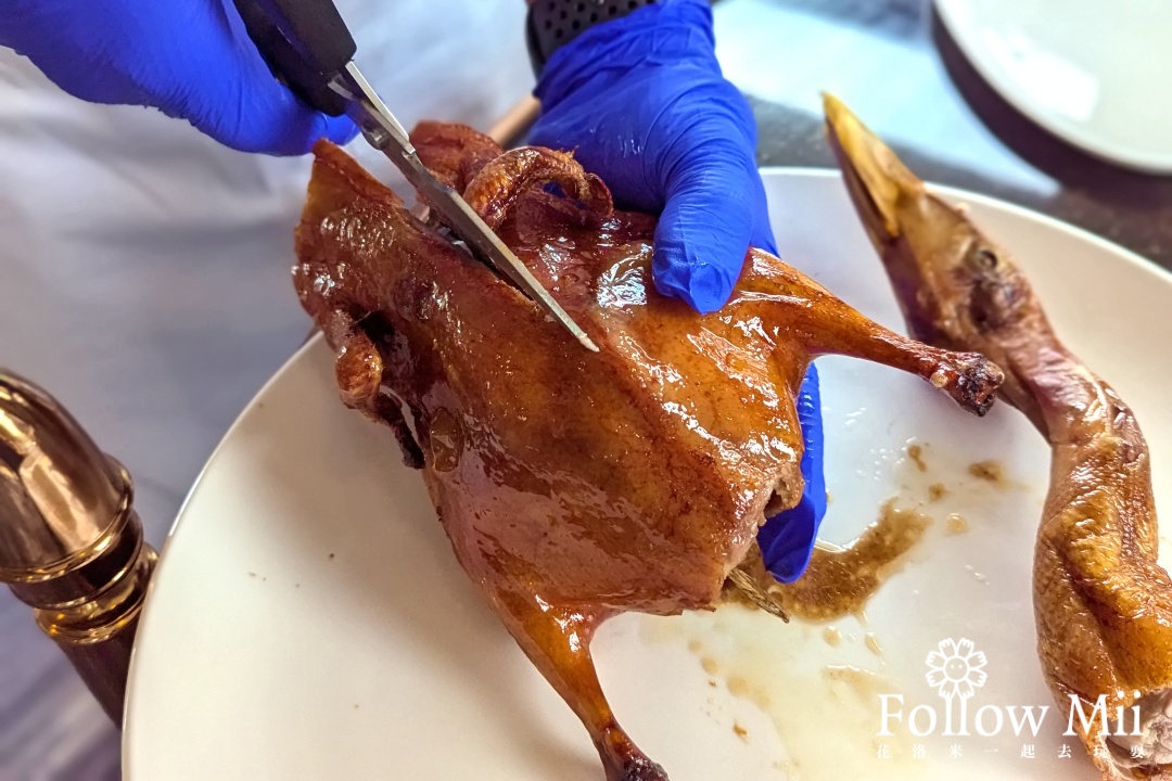 廚師推著剛烤好熱呼呼的鴨子到我們面前,香氣都飄過來了。這取自蘇東坡” 竹外桃花三兩枝,春江水暖鴨先知”的先知鴨,比起一般的烤鴨個頭較小,但也較為鮮嫩。