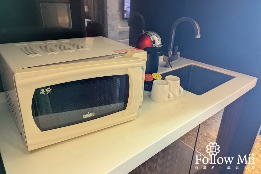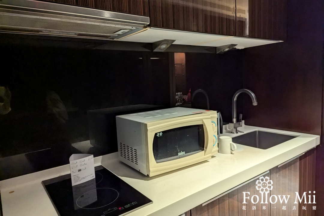 其實一進門走道兩邊頗有玄機啊!一邊是廚房空間,真的是可以煮東西的廚房喔!有電磁爐也有微波爐,連抽油煙機都有了,整套都附給你用!