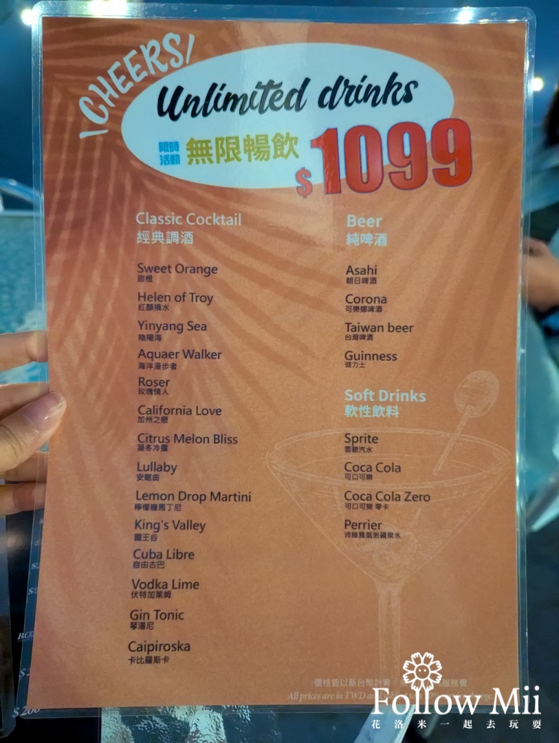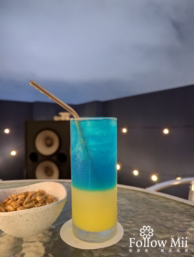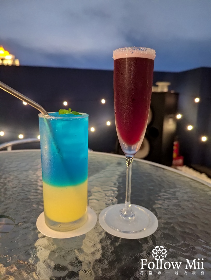 這杯藍色很美的是海洋漫步者,喝起來甜甜的,酒精濃度不會太高。很適合想喝一點點酒精放鬆一下的人。