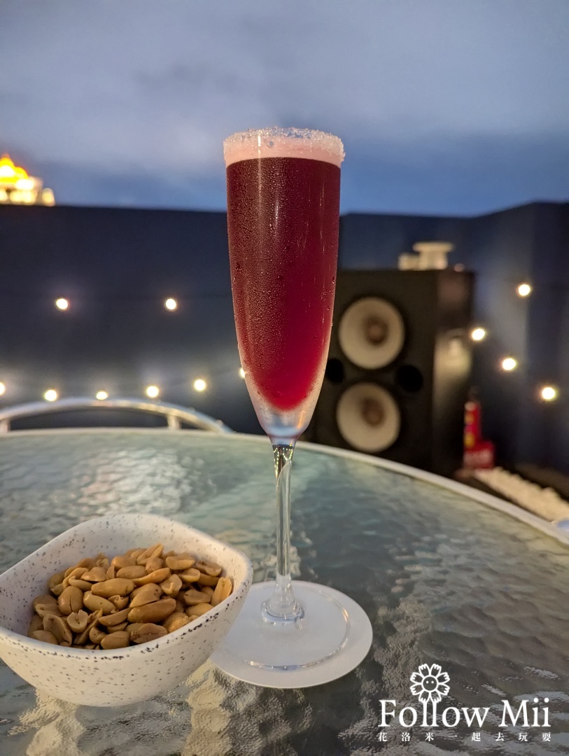 我點的這杯是玫瑰情人,紅酒為基底去調的,喝起來有一種紅酒氣泡酒的感覺,很適合女生喝的酒。