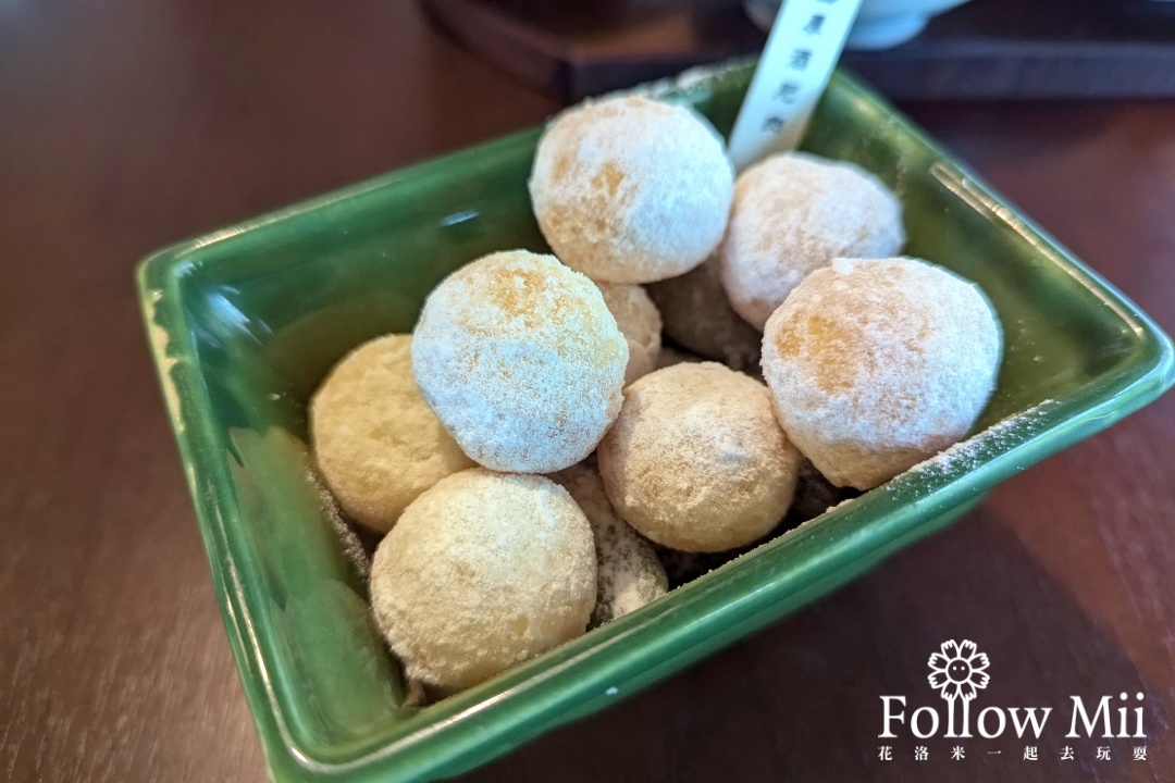 我們加點了小米甜圈圈,我大推薦這個。不是甜甜圈,是甜圈圈喔!有點像是湯圓炸好裹上糖粉,總之剛炸好熱熱的超好吃。